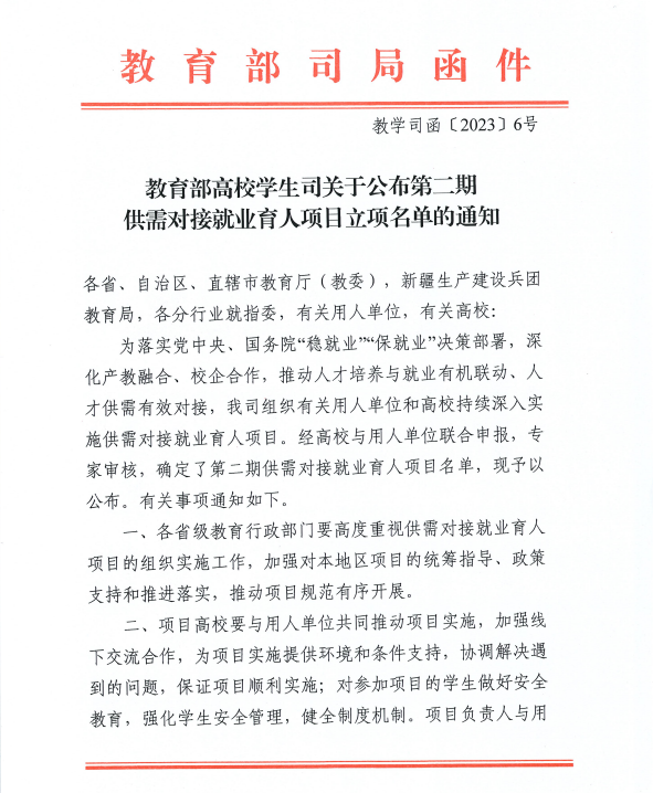 2022年10月,教育部高校学生司第二期供需对接就业育人项目启动申报。供需对接就业育人项目是教育部贯彻落实党中央、国务院“稳就业”“保就业”决策部署的举措之一,旨在深化高等教育改革,推动就业与培养有机联动、人才供需有效对接,分为定向人才培养培训、就业实践实习基地建设、人力资源提升、重点领域校企合作四类,通过开展合作,帮助用人单位培养和招聘更多创新型、复合型和应用型人才。