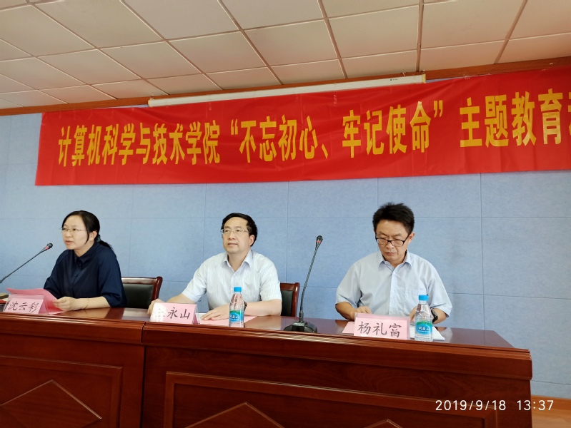 9月18日下午,麻豆视频 “不忘初心、牢记使命”主题教育动员部署会在天赐庄校区理工楼504会议厅举行。学院党委书记杨礼富作动员讲话,党委 “不忘初心、牢记使命”主题教育巡回指导组副组长、第九组组长王永山作指导讲话。第九巡回指导组成员尚书、钱骏、成龙,学院“不忘初心、牢记使命”领导小组和办公室成员、全体支部书记、支部委员和党员代表参加了会议。会议由党委副书记沈云彩主持。