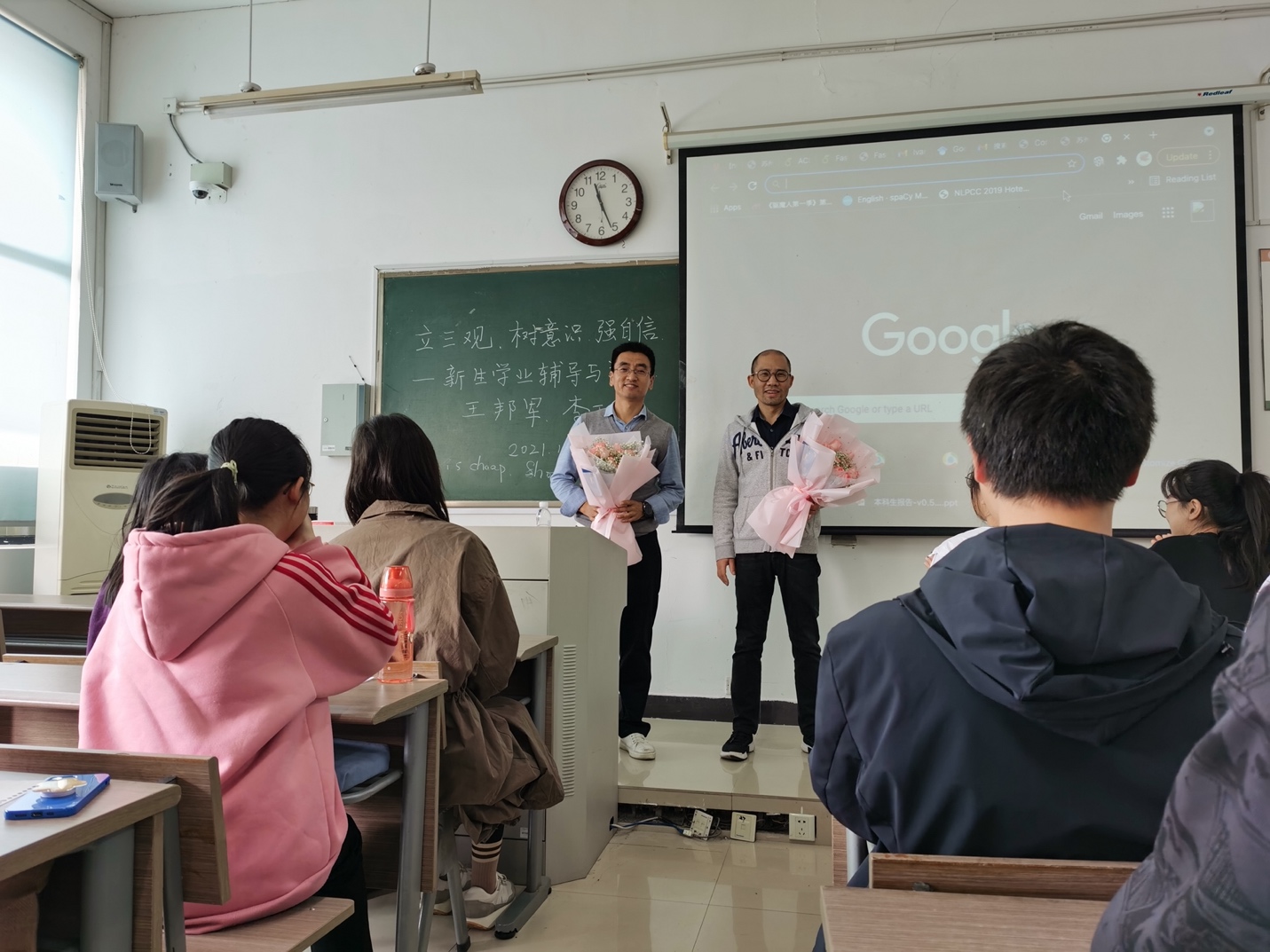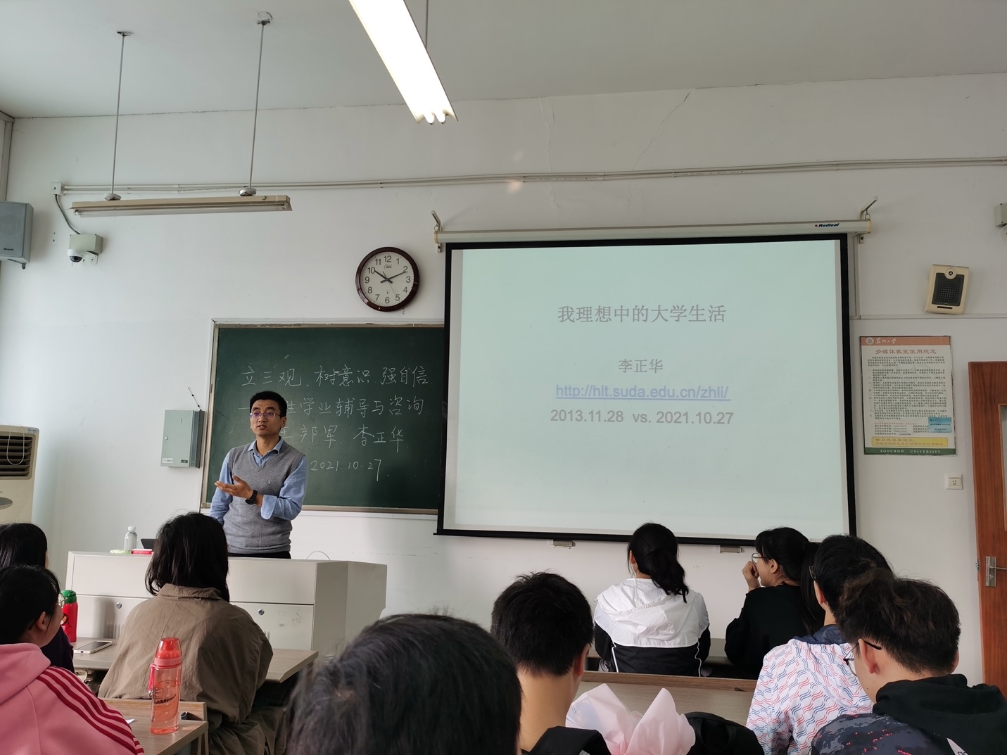 2021年10月27日上午10:00-11:30,麻豆视频 计算机学院人工智能党支部支部书记王邦军老师、组织委员李正华老师来到阳澄湖校区1C401教室,和81名2021级人工智能专业新生进行交流。活动的主旨是“立三观、树意识,强自信 -- 新生学业辅导与咨询”。活动由未来科学与工程学院陈贝贝、陈恺两位老师组织和主持。