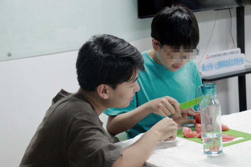 “等我们老去以后,孩子该怎么办”,这是摆在孤独症患者家长面前的最直观的问题。对此,实践团队推出了以促进孤独症患者社会融入、辅助就业为目的的课程。在残疾人之家,实践团队的七名志愿者加入辅助性就业培训课堂,陪伴和辅助“星青年”们完成手工劳动实践,助力暑期职业培训服务顺利进行。志愿者和“星青年”们共同完成了多种装饰品、生活用品的制作,包括马赛克杯垫、冰箱贴以及手提包等。