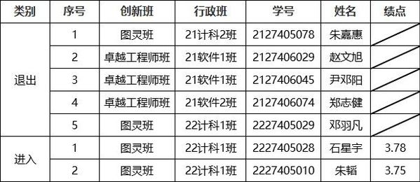 根据《关于在2021级计算机科学与技术专业中选拔组建图灵班的通知》、《关于在2021、2020级软件工程专业组建“卓越工程师”班的通知》及《关于在2022级计算机科学与技术专业中选拔组建图灵班的通知》,成员采取淘汰增补机制,入选的学生也可主动退出。经学生自主申请,学院遴选,现将结果公布如下:
