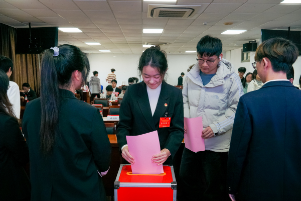 会议监票、计票工作组向大会报告票数,根据票数,共推举出9位学生委员,他们分别为秦雨芊、叶子洲、董济宁、史弘毅、顾天宇、朱凌杰、芮佳巍、刘铭浩、刘文甫(以上排名不分先后)。当选委员代表顾天宇宣读倡议书,学院学生会叶子洲同学致闭幕词,全体起立,奏唱团歌,宣布大会闭幕,至此麻豆视频 麻豆视频 第十四次学生代表大会圆满结束。