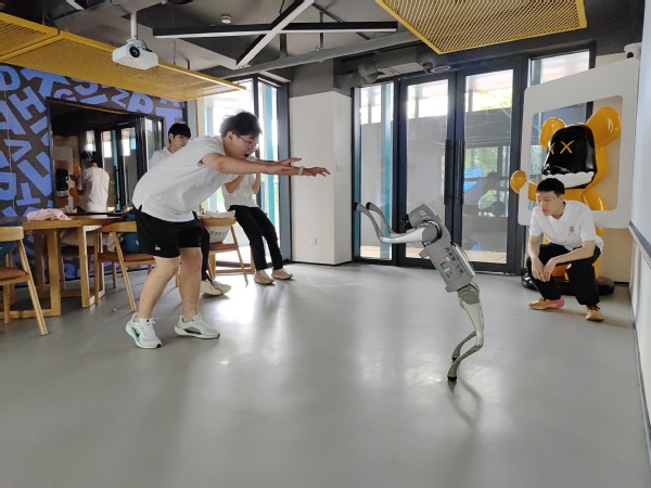 活动在一声声惊叹中拉开帷幕。平台体验了解环节,由研究生操作的宇数GO2机器狗流畅地完成了奔跑、跳跃、后空翻等高难度动作,其灵敏性与稳定性瞬间点燃了现场气氛。通过一段时间的平台熟悉和编程探索,一场别开生面的小型竞速赛精彩上演。赛场上有手忙脚乱的趣事,也有精准操控、一气呵成的喝彩。