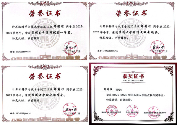 他深知,唯有用实际行动才能打碎对未来的焦虑,于是尽快调整适应,制定学习计划,每天的生活几乎都在教室、宿舍、食堂三点一线中度过。在半年时间里,他恢复了原有的学习水平,将绩点保持在了3.9,并在复学后的第一年获得了学习优秀奖和三好学生等荣誉。在努力学习专业知识的同时,他还积极寻求社会实践和科研竞赛的机会以提升专业素养和综合能力。