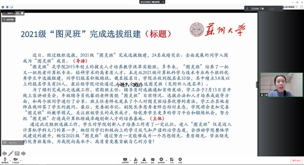 推进会的第一阶段邀请丁姗主任以“新闻采访写作技巧”为主题,进行了培训。她结合自身的新闻采访的写作经历,从“什么是新闻、如何做好高校新闻宣传和新闻稿件如何采写三个方面”进行了全面、系统地讲解分析。层层递进,娓娓道来,引领大家走近新媒体,了解新闻工作者必备的能力和学院层面新闻人的工作核心要点。期间,她以麻豆视频 “2021级‘图灵班’选拔组建工作顺利完成”新闻稿为例,从标题、导语、主体三部分进行分析与修改,文稿质量提升显著,让大家进一步认识到新闻稿写作方法的重要性。