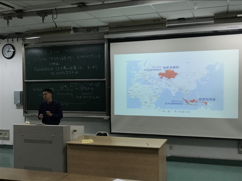 顾明高老师从“一带一路”倡议的主要含义、内容与前景三个维度展开党课的内容。首先,顾老师另辟蹊径,由学生视角切入发问,从而巧妙地展开了对于中国提出“一带一路”倡议的必然性与主要缘由的讨论。他指出:中国之所以提出“一带一路”倡议,是因为其改革开放需要向西加强与发展中国家的合作,从而为未来赢得先机;而关于为什么只有中国提得出“一带一路”的问题,顾老师认为其原因在于中国丝绸之路精神的传承,以及天下大同文化观念的延续。