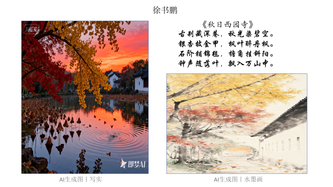 活动中,同学们走进平江路、拙政园等苏州街巷园林,用镜头捕捉立冬时节的气候变化与人文风貌。随后,大家借助DeepSeek、文心一言等AI工具,围绕“诗说冬踪”与“画意新编”两大方向进行创作,将实地拍摄转化为具有水墨、油画等风格的数字艺术作品,并融入诗词创作,深化了冬日意境的表达。