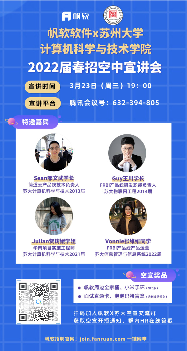 观看线上宣讲直播,赢取直通面试Pass卡,HR&学长学姐现场答疑,帆软精美周边礼品随机掉落!