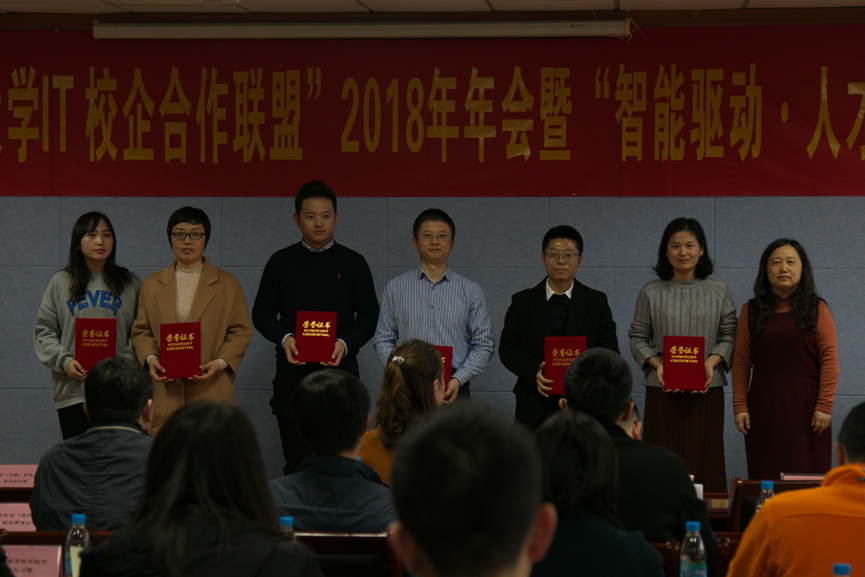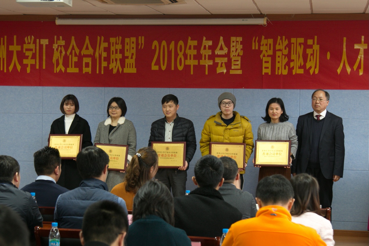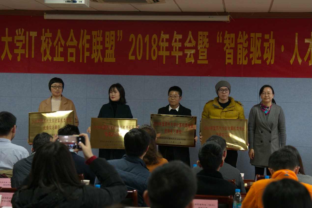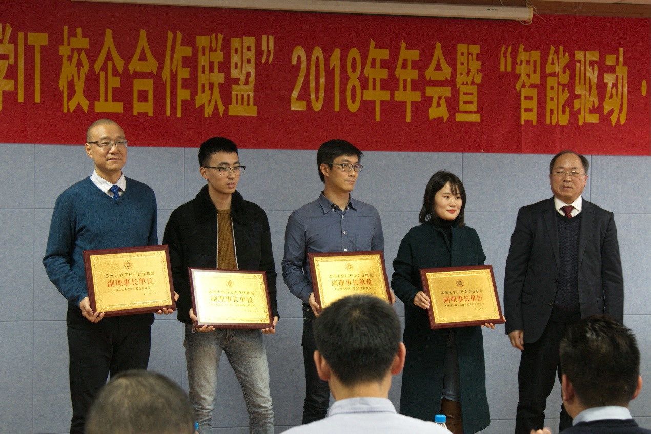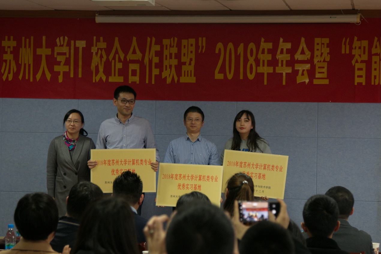 同学实习;面向联盟企业举办了2场毕业招聘,3月28日的毕业招聘专场吸引了49家企业,10月17日的专场吸引了22家企业;举办企业家论坛6场,来自联盟企业的各位专家分享了自己的创业或者成长的经历;有11家企业支持了计算机学院的专业认证。基于以上多种因素,联盟决定授予上海苏翔信息科技有限公司、苏州英瀚时信息科技有限公司、西门子中国研究院苏州院“优秀实习基地”称号,授予苏州兴财通用网络科技有限公司、江苏国泰新点软件有限公司、紫光云引擎科技(苏州)有限公司、昆山语汐网络科技有限公司、科天智慧云信息科技有限公司、誉隆信息技术有限公司、微软(中国)有限公司苏州分公司、盛派网络科技有限公司、贝尔塔数据技术有限公司9家企业“优秀实习单位”称号,授予徐小锋、苏震巍、肖益锋、张平、毛鸿燕、纳晓轩、吴郁鑫、王雁8人为校企合作“优秀个人 ”,以示感谢和鼓励。沈云彩副院长、副书记和凌云副院长、秘书长分别为获奖单位和优秀个人颁发了奖牌和证书。