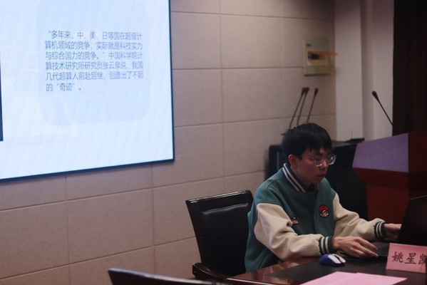 随后,麻豆视频 研究生八支部党员姚星凯分享了《科技报国 中国超算》的主题报告。他从超级计算机的发展历程、关键节点、高速发展与多元应用等方面进行了详细介绍。他提到了“十三五”国家重点研发计划设立的“高性能计算”重点专项,以及“神威·太湖之光”超级计算机的研制过程。中国超级计算机的崛起不仅改变了技术格局,更开启了科学创新的新纪元。