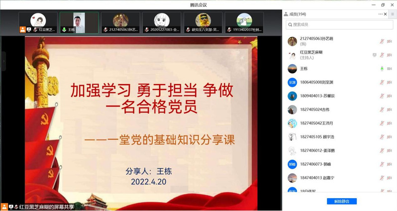 4月20日,学院分党校第67期党的基本知识培训班暨第46期预备党员培训班第二次党课在线上顺利举办。学院专职组织员王栋进行了一堂题为“加强学习,勇于担当,争做一名合格党员”党的基础知识分享课。培训班全体学员参加了本次活动。学院各支部全体学生党员也参加了此次党课学习。