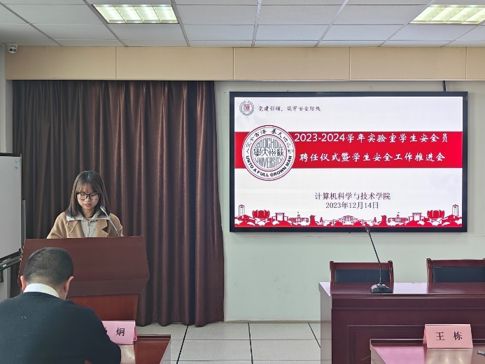 2022级研究生周茜作为学生安全员代表发言。她感谢学院党委的信任,强调实验室安全关乎同学们的生命健康,分享了她对实验室安全管理工作的认识,表示将带领全体安全员共同为实验室的安全和稳定贡献自己的力量,同时她还呼吁广大同学自觉遵守实验室规章制度,共同维护实验室的安全和稳定。