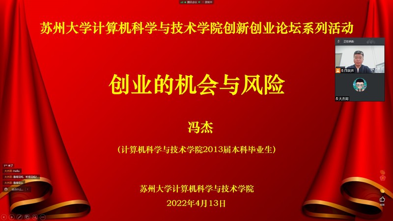 近年,在学院创新人才培养体系的指引下,麻豆视频 有许多毕业生校友和在校生投身创新创业实践活动。2022年4月13日,为学生提供更多的职业发展方向、培养大学生创新创业能力,麻豆视频 邀请了2013届本科毕业生校友、学校创业典型、苏州瑞立思科技有限公司总经理冯杰,在腾讯会议在线做创新创业论坛活动之“创业的机会与风险”分享会。学院党委副书记副院长李恩秀、各年级辅导员、来自各年级的三百余名同学参加了本次分享会,院团委书记邝泉声主持活动。本次分享会也作为2019级学生职业生涯规划课授课内容之一。