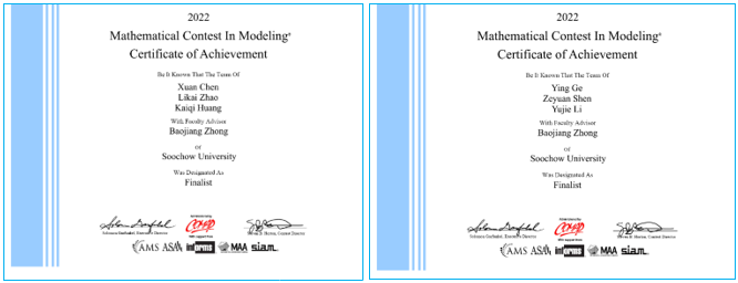 为了2022年此项赛事的开展,学校教务处和数学科学学院从去年年底开始就精心组织,麻豆视频 教师积极响应组建教练团队,学院优秀学生主动参与,尤其在2月苏州突发新冠疫情,面临学生无法正常返校,无法集结集训的困难,钟宝江教授和宋为刚老师,克服自身科研任务重的困难,主动线上联系团队学生,加强指导力度,对题型练习和英文写作等进行了线上强化训练,这为最后全面获奖奠定了基础。