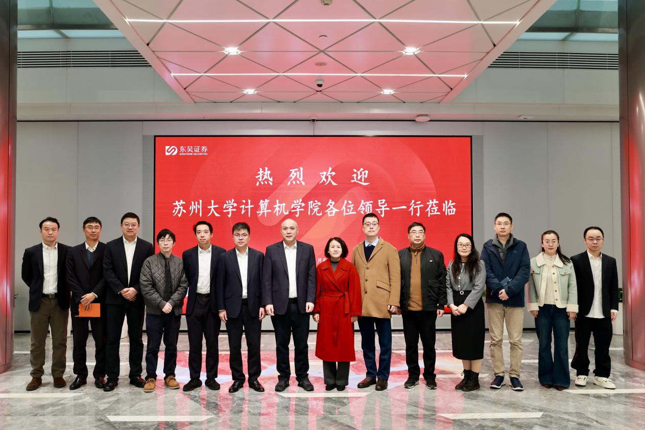 在东吴证券股份有限公司,学院团队受到了党委委员、副总裁高海明,首席信息官华仁杰等高管的热情接待。高海明向学院一行系统介绍了东吴证券近年来的整体发展态势、行业地位与战略布局,特别强调了公司在稳健经营与创新发展方面取得的显著成绩。华仁杰则具体分享了公司在数字金融领域的技术突破、信息化建设成果以及未来IT人才的需求规划。随后,黄河介绍了学院在学科建设、科研方向及一体化人才培养体系方面的优势与特色。双方围绕联合科研攻关、共建实践平台、促进学生实习与就业等方向进行了务实交流,并达成多项共识。