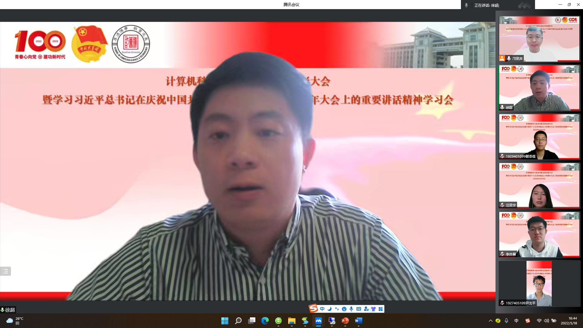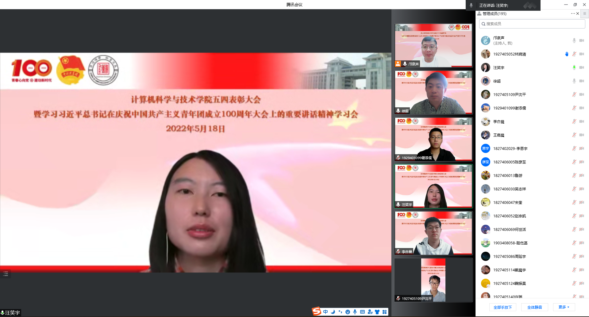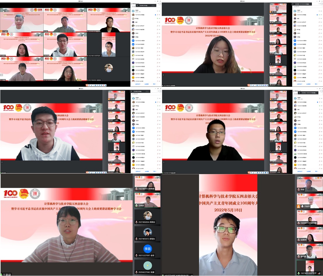 于腾讯会议在线举行院五四表彰大会暨学习习近平总书记在庆祝中国共产主义青年团成立100周年大会上的重要讲话精神学习会。院党委副书记、副院长李恩秀出席会议,院团委副书记徐超、院团委教师兼职副书记汪笑宇老师、全体辅导员老师,及计算机学院全体学生团学骨干200余人参加。会议由院团委书记邝泉声主持。