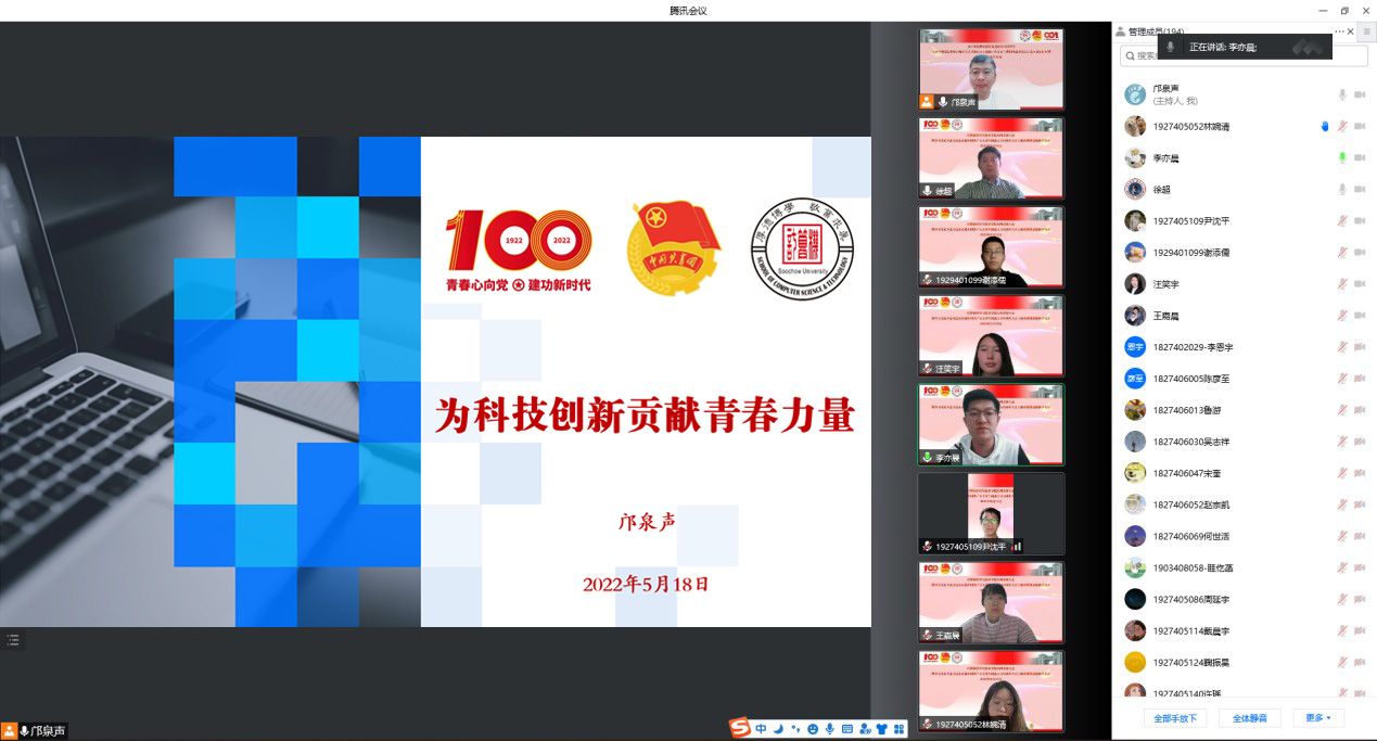 邝泉声给与会团员青年上了一堂微团课《为科技创新贡献青春力量》。结合超级计算机这一科研领域,讲述我国科研人员从上世纪五六十年代以来,对这一科技制高点从仰望、追赶、超越、被“制裁”到破局的过程。在这一领域中,我国几代科技工作者前仆后继的努力,改变了我国曾经落后的局面,已成为世界超算领域的主要引领者。在百年未有之大变局的当今,也面临前所未有的“制裁”、打击和挑战。结合习近平总书记在庆祝中国共产主义青年团成立100周年大会上的重要讲话精神,牢记习近平总书记对共青团的希望,他号召计算机学院的团员青年抓住历史机遇,苦练专业本领,提升科创能力,为将我国建成世界主要科学中心和创新高地而贡献自己的青春力量。