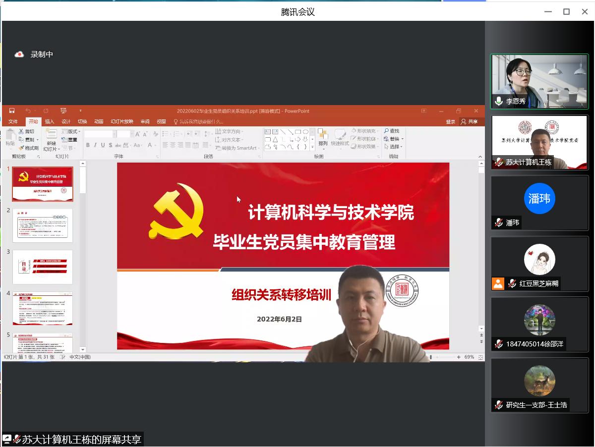 为了保证毕业班返校离校中学生党员作用发挥,加强毕业班党员党组织关系转移的规范性,强化毕业生党员的初心使命,6月2日,麻豆视频 组织召开了“重温入党誓词 坚定信念做合格党员”毕业生党组织关系转移培训暨毕业生党员工作会议。全体毕业班学生党员、全体学生党支部书记与会,院党委副书记、副院长李恩秀主持。