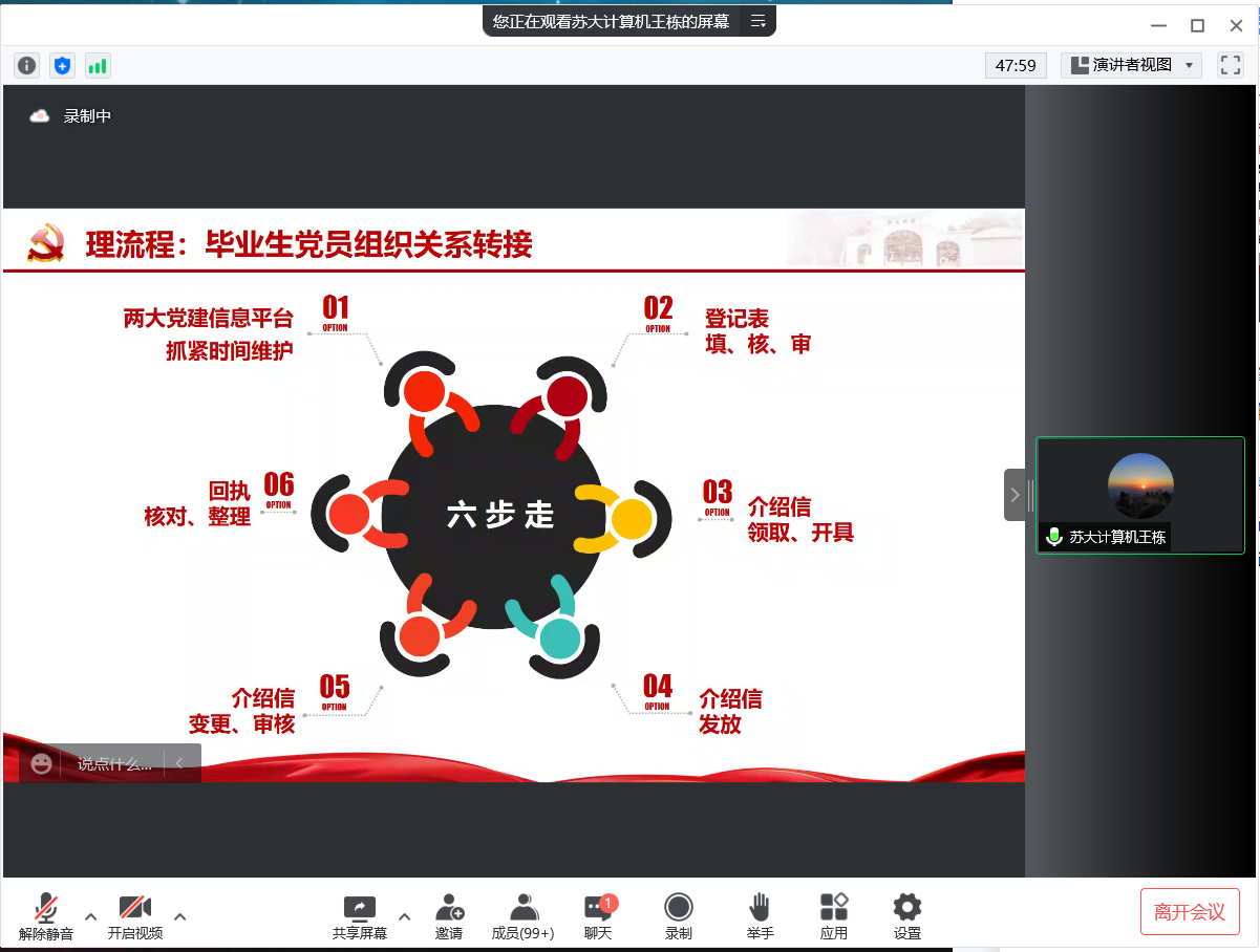 首先,李恩秀强调,党员组织关系转移是党员组织生活中的一件重要大事,要高度重视,要谨慎处理,个人党组织关系转移当中会面临各种情况,必须提前知悉。接着,学院专职组织员王栋从“学党章、强党性、做表率”专题教育活动开展、毕业生党员信息登记工作、毕业生党员档案检查工作和党员组织关系接转具体安排等四个方面进行了培训。王栋着重讲解培训党员组织关系转移工作,要求“应登尽登,应转尽转”,并从组织关系转移的原则、类型、组织关系转移表的填写、介绍信等方面详尽地对组织关系转移进行了讲解培训。王栋还为毕业年级党员梳理了党员组织关系转移的流程。他强调,毕业班党员组织关系转移流程的六步走,转移过程的各个时间节点需要牢记,不能拖沓。最后,李恩秀针对党员材料和预备党员身份相关问题和情况进行了补充和强调,王栋对大家提出的问题逐一耐心解答。