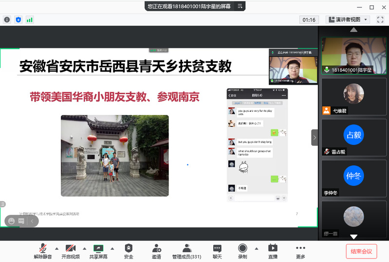 会议由弋维君老师主持。2018级人工智能试验班的陆宇星同学作为标兵代表发言,他的发言主要围绕参与志愿活动为他带来的反思与成长。自高中毕业以来,陆宇星同学就积极参与到包含国际处、支教、星儿计划等多领域、多方面的志愿活动。回顾这些经历,他感叹志愿活动为他个人带来了成就感、提升了他沟通交流、团队协作、组织协调等多方位的能力。最后,作为院青协的负责人,他也为大家分享了一些进行志愿服务的途径。