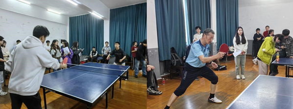 在比赛开始前,参赛教师与同学们陆续到达场地进行签到、热身并合影留念。紧接着,随着裁判的一声哨响,比赛正式拉开序幕。在预选赛、小组赛、淘汰赛的多轮角逐过程中,老师们凭借稳健老练的技巧点燃了学生们的竞技热情。同学们全力以赴,与老师们在乒乓球桌上展开技艺切磋,相互学习,共同进步。