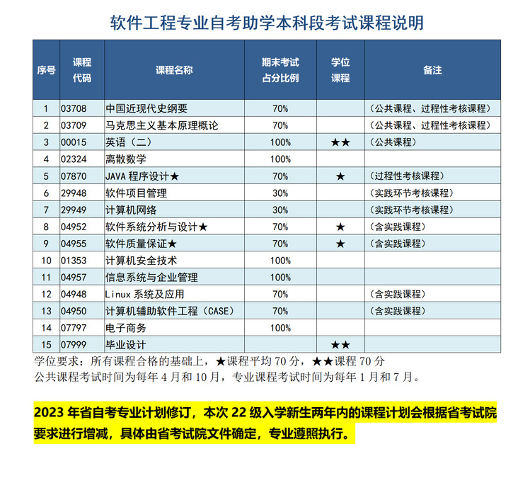 软件工程(自考助学)专业本科段入学时间为每年9月,学习年限为两年(成绩全部合格,需凭专科毕业证书备案表,办理本科毕业)。由江苏省自学考试委员会发放自学考试毕业证书,并附署主考学校,国家承认学历。自考助学本科毕业生在办理本科毕业的同时,如符合申请学士学位条件者,可授予学士学位。