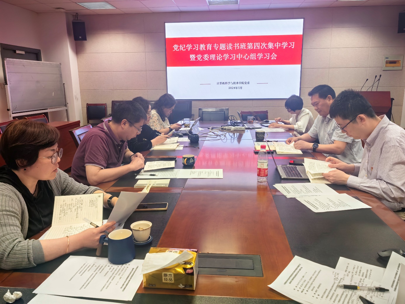 近日,计算机科学与技术学院党委召开党纪学习教育专题读书班第三次、第四次集体学习会,深入学习《中国共产党纪律处分条例》(以下简称《条例》)廉洁纪律、群众纪律、工作纪律和生活纪律有关内容。学习会由院党委书记胡新华主持,学院领导班子成员、院党委委员、综合办公室主任参加了学习。