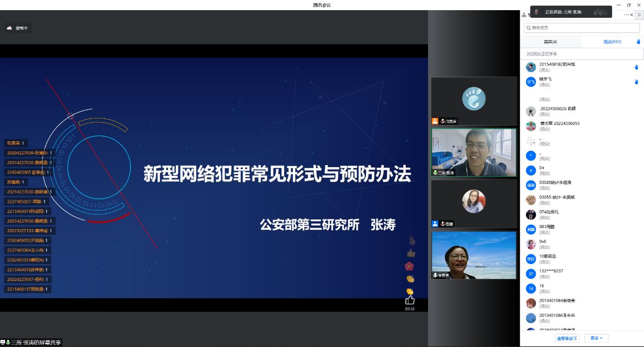 整场讲座气氛热烈,互动频繁,张涛老师在线回答了十余个大家在线提出的问题。同学们学习了常见网络诈骗类型,理解了各种诈骗类型背后的产业链条,有效提高了同学们防范网络诈骗的意识,为营造清朗和谐的网络空间增添了一份安全保障。