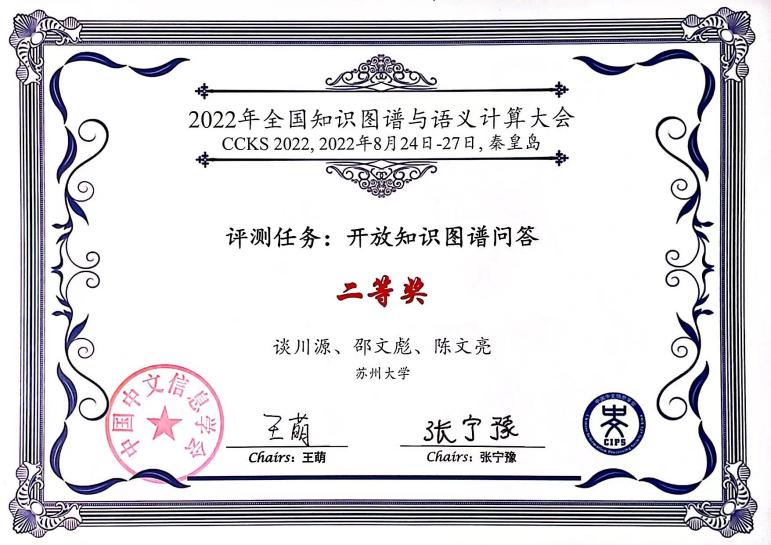 谈川源与邵文彪两位硕士生在陈文亮教授的指导下组队参与开放知识图谱问答评测。该评测任务依托CCKS 2022,由北京大学王选计算机研究所组织,共吸引221支队伍参加。小队运用储备的理论知识与组内积累的研究成果,构建一套基于查询图的知识图谱问答系统,在最终榜单中取得第二名的成绩。