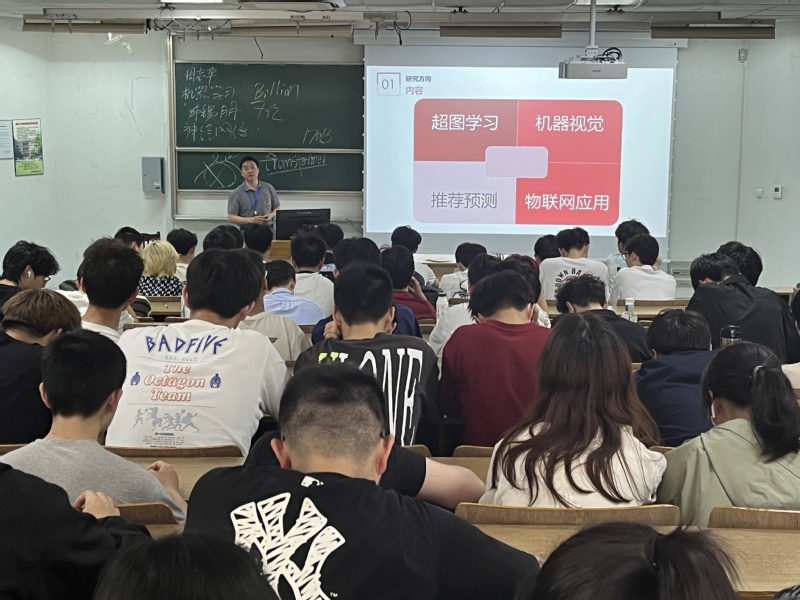 最后,院长助理杨哲副教授,从“机器学习”、“计算机视觉”、“超图学习”、“物联网应用”等四个领域出发,简述了他们实验室的研究方向以及成果。这些项目示例激发了大家对于科研的兴趣和热情,引导同学们思考这些领域的应用会如何改变人们的生活和工作方式,思考实验室研究的成果对于社会和科技发展的影响,从而可以进一步明确自己的学习方向。