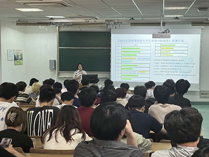 首先,软件工程系支部书记章晓芳教授,为同学们分享了许多适合大学生参与的优质榜单赛事,例如“全国大学生软件测试大赛”、“全国大学生数学建模竞赛”、“蓝桥杯”等。她推荐同学们可以通过参加比赛,“以赛促学”,在比赛的过程,不断挑战自我,发现并弥补自身的不足,进一步丰富自身水平,从而提高自我专业能力。
