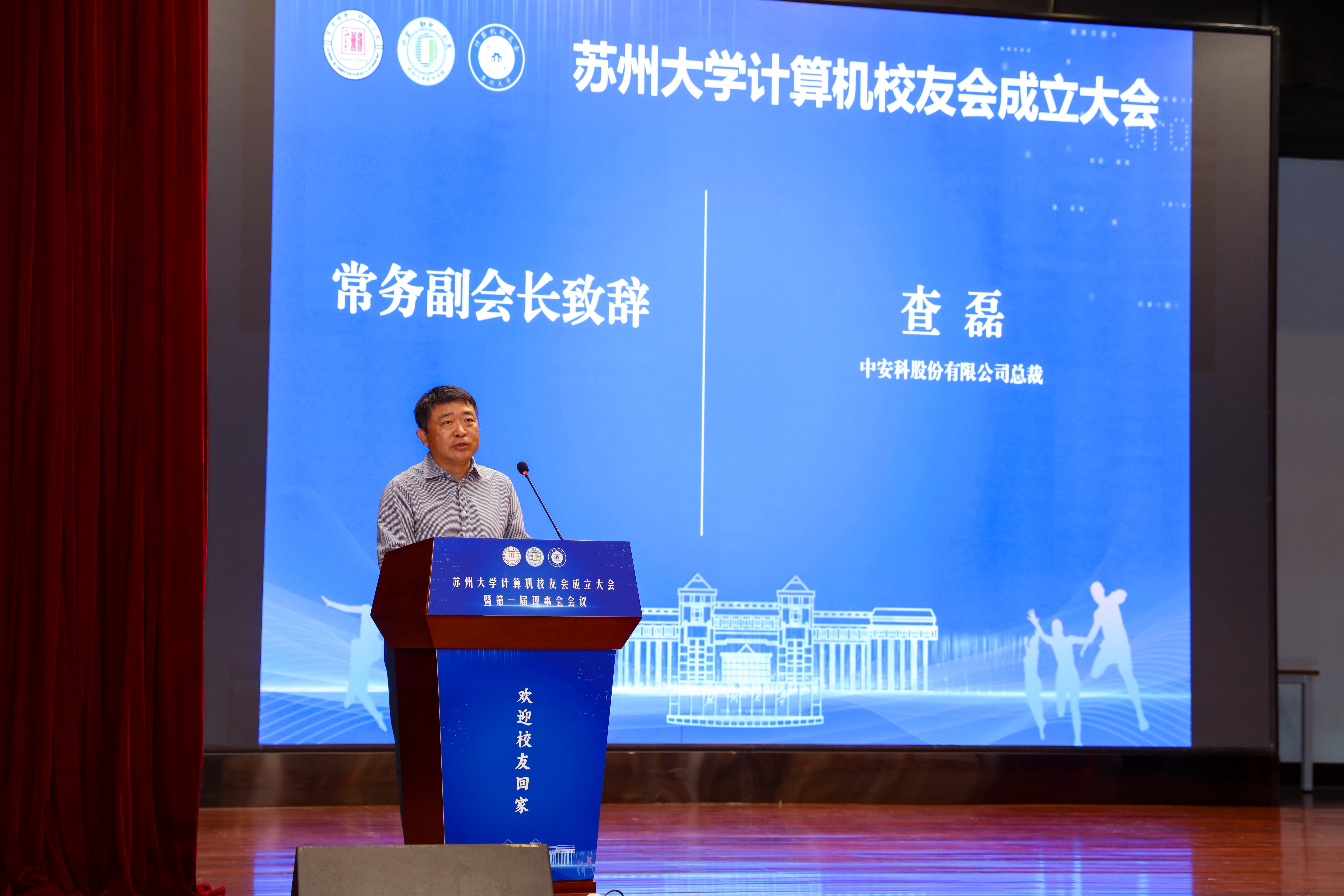 麻豆视频 计算机校友会第一届理事会常务副会长查磊发言。他感谢学校、学院以及广大校友对自己的认可,作为第一届理事会常务副会长倍感压力和责任,他表示将不负众望,以服务校友、服务母校、服务社会为宗旨,努力发挥校友会的作用,聚焦校友的不同层次需求,发挥校友会情感聚人、服务聚心、合作聚力的作用。