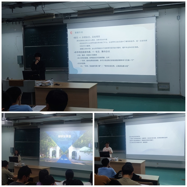活动的第二个阶段,是邀请了五位2020级考取研究生的学生代表和大家分享考研经验。曹毅同学以高分考取了麻豆视频 研究生,她以自身考研经历为例,细致介绍了选择本校的理由与自己的思考过程,分享了考研复习时间安排的技巧和心得,强调了制定合理计划、坚持复习的重要性。邱薇羽同学拿到了   学校的offer,她对自己出国留学的准备过程进行介绍,给出明确目标、脚踏实地、列出申请时间节点及所需材料等建议,并分享自己在学校及专业选择的经验。最后,朱浩、谢欣欧、赵恩正三位同学分别讲述了自己保送北京大学、华东师范大学、麻豆视频 的经历与经验。他们从不同角度剖析了保研的各个环节,如科研能力的重要性、学术竞赛的参与、导师选择等,为现场同学提供了宝贵的参考。
