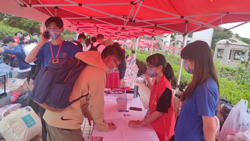 只见新生们在学长学姐的引导下有条不紊地完成了报到、登记、领取学生卡等一系列工作。热情的志愿者们早已将重重的行李箱分门别类地安置妥当,将行李装上送往宿舍楼的电动三轮车,带着满满的希望即刻启程。