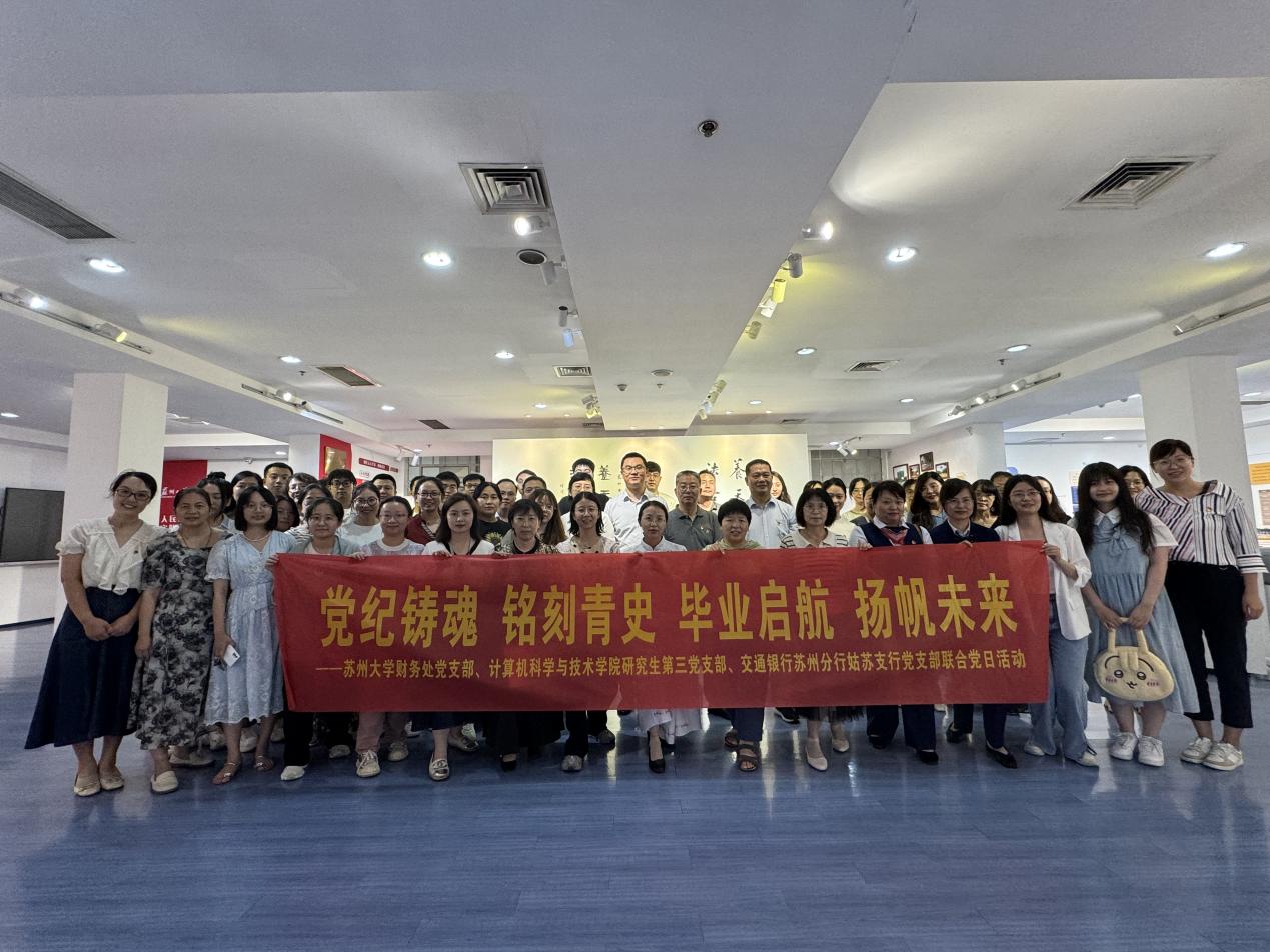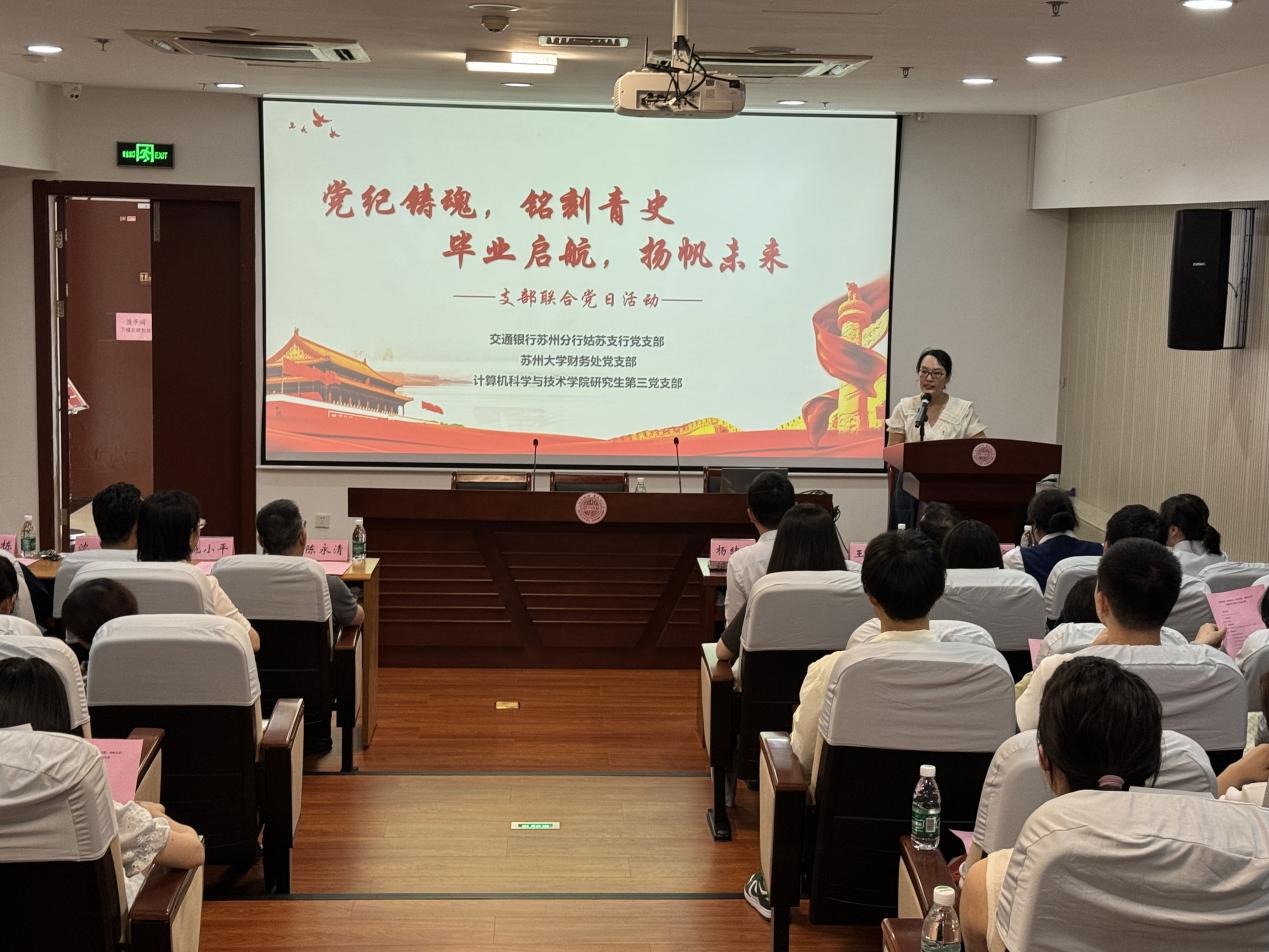 为加强党员纪律教育,传承党的光辉传统和优良作风,激励毕业生党员不忘初心、牢记使命,以更加坚定的信念和昂扬的姿态迈向社会。6月19日下午,麻豆视频 研究生第三党支部与麻豆视频 财务处党支部、交通银行苏州分行姑苏支行党支部联合开展党纪学习教育主题党日活动。麻豆视频 党委书记胡新华,学院党委委员、组织员王栋,麻豆视频 财务处处长、党支部书记陈永清,财务处副处长、支部纪检委员施小平,财务处副处长沈军,交通银行姑苏支行副行长杨绪宽,交通银行苏大支行行长王玮寅以及研究生第三党支部、财务处党支部、交通银行苏州分行姑苏支行党支部党员参加了本次活动。活动由研究生第三党支部书记高珊主持。