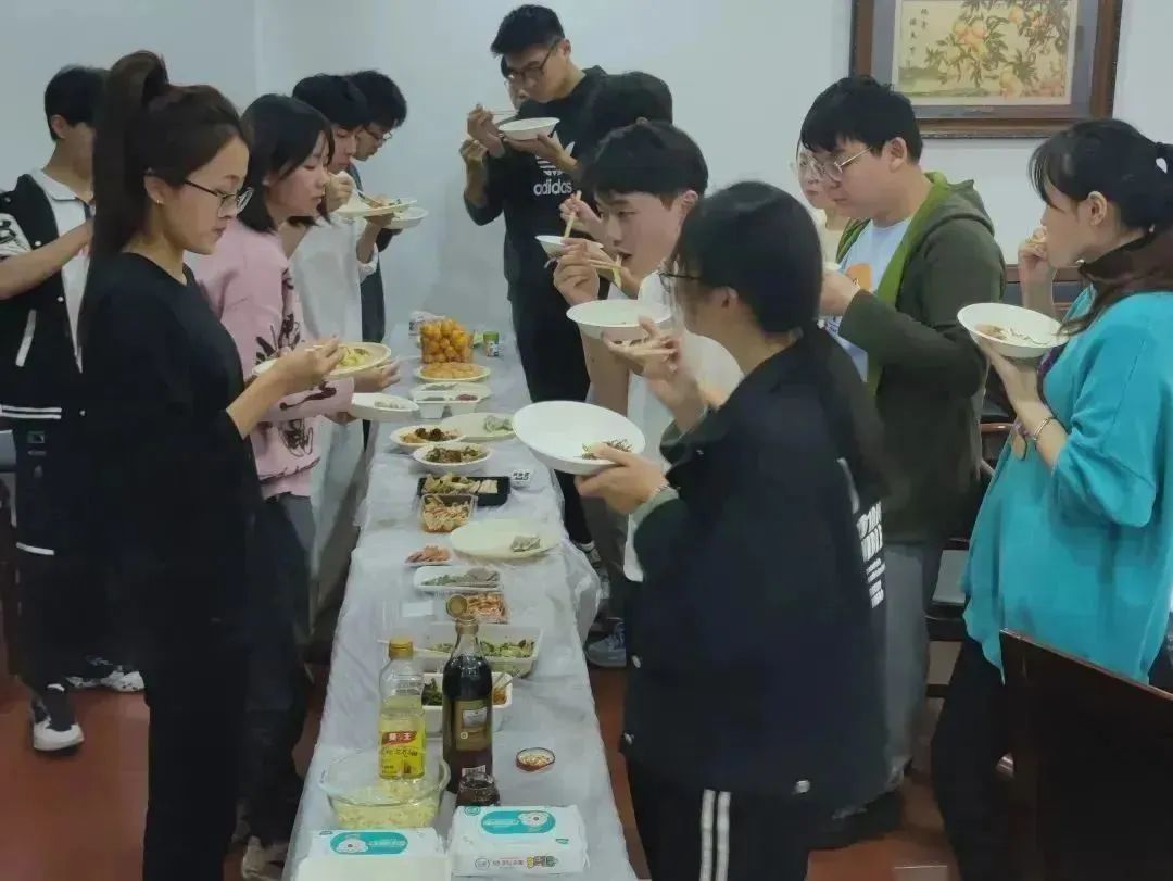 老师和同学们协作将饺子煮好后,大家互相品尝着自己的劳动成果,聊着家常,其乐融融。