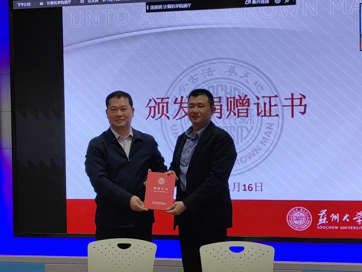 随后,学校和企业代表双方进行了捐赠的签约仪式,胡书记代表学院给企业颁发捐赠证书,感谢企业对学校、学院人才培养和教育建设的支持。