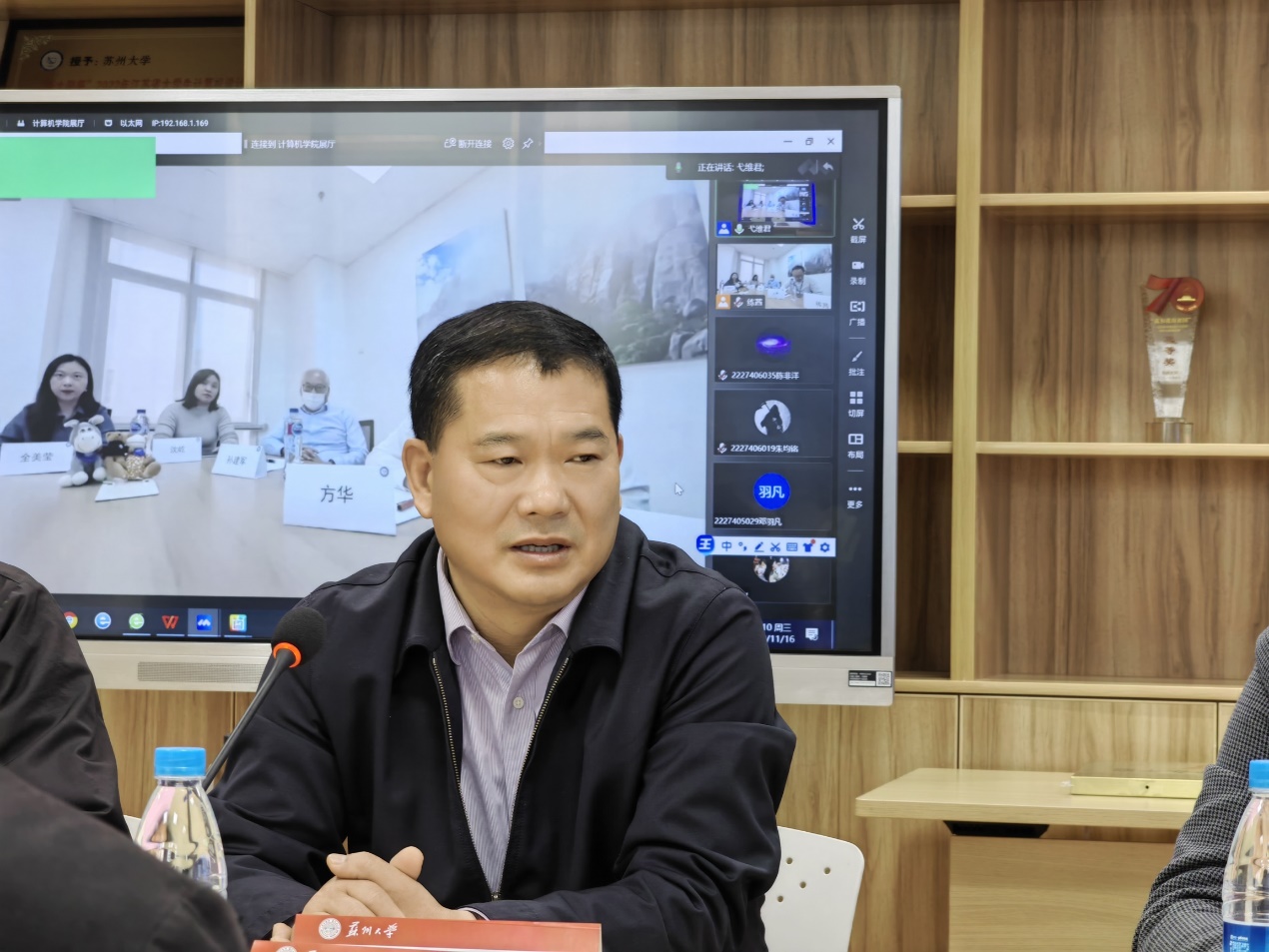 之后TUV SUD北亚区高级副总裁孙建军代表TUV SUD致辞,对TUV SUD的发展历程、企业优势、数字化战略、人才培养规划以及创立“TUV SUD创新奖学金”的初衷进行了详细介绍,表达了对后续更多深入合作的期望。苏州沃柯雷克智能系统有限公司总经理&创始人张子洋先生作为计算机学院的杰出校友,希望学生珍惜在校时光,努力学习。他讲述了公司在各个涉及领域的发展,对公司进行简单介绍,期待今天的合作是个开始,希望未来有更多合作机会。