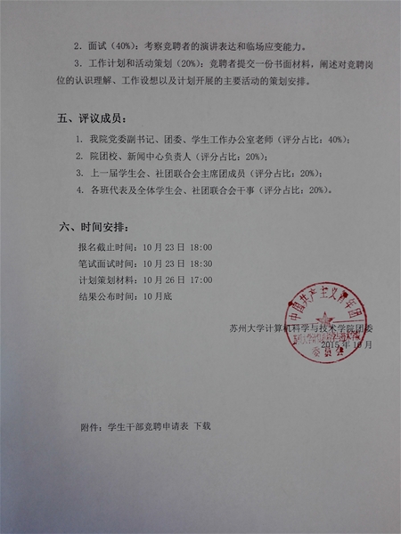 10月23日 18:00前进行报名和资格审核,有意参选的同学填写纸质的《麻豆视频 学生干部竞聘申请表》,填好照片后交到院团委办公室。