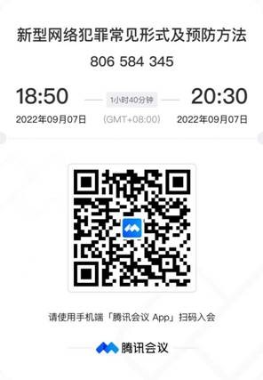 (三)参加网络安全专题讲座 讲座主题:新型网络犯罪常见形式及预防方法 主讲人:张涛 公安部第三研究所网安中心副研究员,高级工程师,中国人民公安大学特聘导师,主要研究方向为网络安全、大数据分析,近年参与或负责了多个国家及省部级科研课题,参与公安部大数据标准制定工作,多次荣获个人嘉奖、个人三等功。 讲座时间:9月7日(星期三)19:00 参与方式:点击专属链接入会,或添加至会议列表: //meeting.tencent.com/dw/qaKgaSEHYKuk 腾讯会议:806-584-345