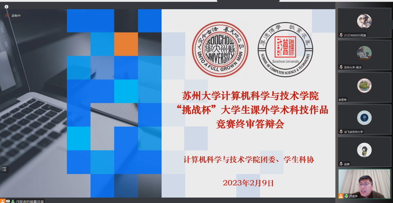为进一步浓厚校园学术氛围,加强学风建设,推动大学生参与学术科技实践、发现和培养创新型人才,为“挑战杯”竞赛遴选培育优秀项目,麻豆视频 团委、学生科协于2023年2月9日13:00在线举行院级“挑战杯”大学生课外学术科技作品竞赛终审答辩会。参加会议的包括各项目组成员、学生科协学生骨干和对科创活动感兴趣的师生。答辩由杨洋、陈伟、谷飞、汪笑宇、宋为刚和校外导师王康作为评委,还邀请到了院党委副书记李恩秀、辅导员赵爽作为嘉宾,会议由团委书记邝泉声主持。