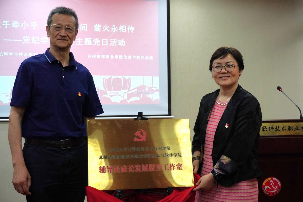 参观结束后,双方一同前往苏州高博职业学院进行参观,并在会议室进行交流学习。在双方领导对各自单位和党组织基本情况进行了介绍之后,苏州高博职业学院信息与软件学院院长孙涌和学院党委副书记、副院长李恩秀共同完成了“辅导员成长发展提升工作室”挂牌仪式,并签订了共建协议。工作室的建立希望两院辅导员能利用平台促进工作实践和科学研究的开展,构建前辈领航和朋辈互助的氛围,达到同行交流和相互促进目标,为两院的辅导员队伍建设服务。