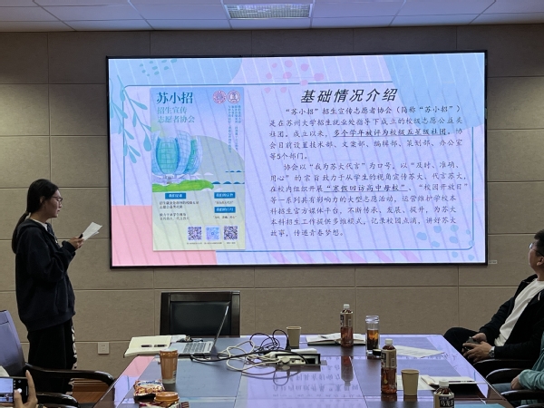 最后,“苏小招”成员周子路代表校招生就业处对学院招生宣传工作的付出表示感谢。她向参会师生详细介绍了“苏小招”招生宣传志愿者协会,她建议2024级两地新生同学们能够快速适应、享受大学生活,多出去走走,体验苏大美景、品味东吴文化,同时能够积极加入“苏小招”团队,利用假期时间返回高中母校,将在美丽苏大的所见所感分享给学弟学妹们,为麻豆视频 吸引更多优质生源。