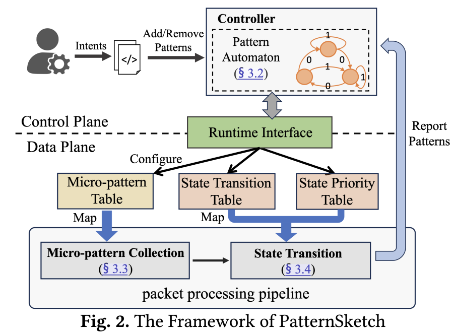 论文的研究工作历时近2年,论文所研究的时序流量模式检测(Time-series Traffic Pattern Detection)问题是高速网络流量测量的核心任务之一,目的是检测并报告网络数据流中出现频率随时间变化规律满足特定模式的若干条特征流。该问题在数据流处理、数据库优化和数据挖掘等领域也有着广泛应用。针对如何在计算与存储资源严重受限的可编程交换机上并发检测多种时序流量模式的艰巨挑战,论文提出了一种名为PatternSketch的通用、可运行时重配置的检测框架,不仅能用一套系统精准检测多种时序模式,还能在不下线交换机的情况下灵活切换监控目标,创新性地解决了为不同时序流量模式独立部署检测模块所带来的模块功能冗余、计算存储资源利用率低、需停机更新检测模块等问题。基于多个真实数据集的实验结果显示,PatternSketch在仅使用200KB空间并发检测6种时序模式时可取得超过90%的F1分数,且能够部署于商用Tofino可编程交换机上,实现通用、可运行时重配置的时序模式检测,具有广阔的应用前景。匿名评审专家对论文的内容给予高度认可,其中Meta-reviewer给出了“Your paper impressed the reviewers with its intuitive new abstraction, which could move the needle on the usability of sketches for complex pattern detection.”的评价。