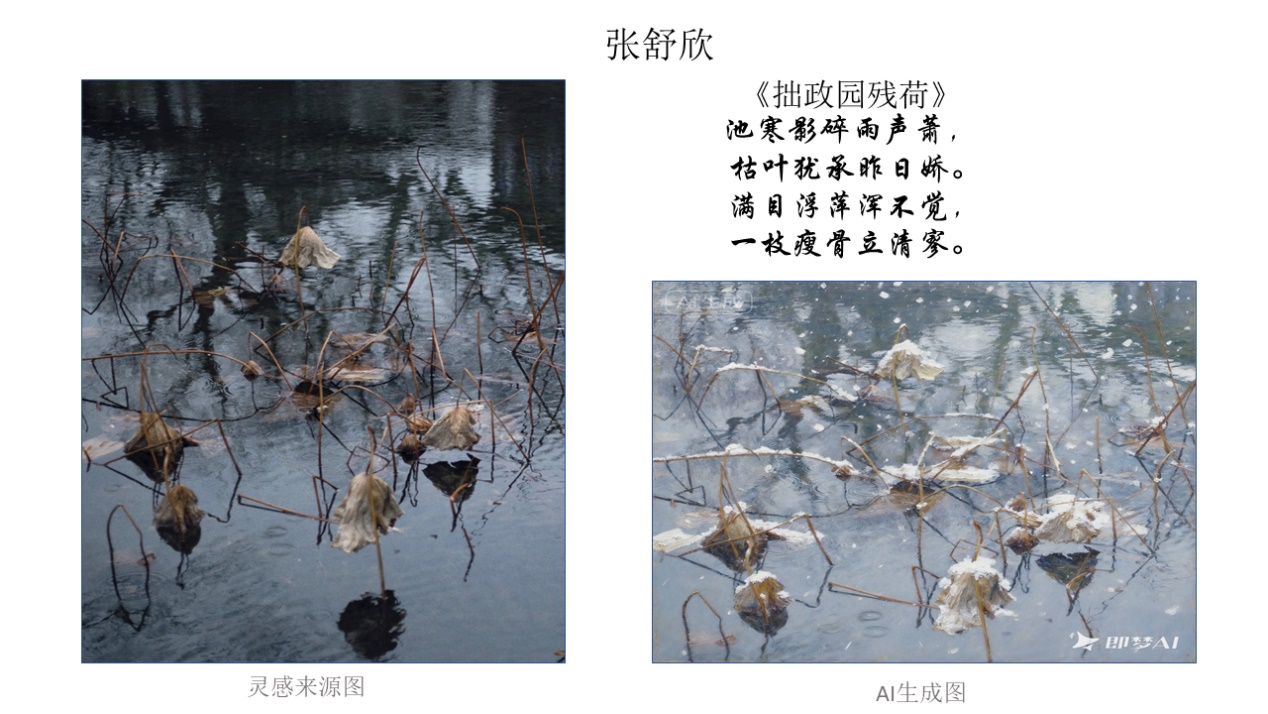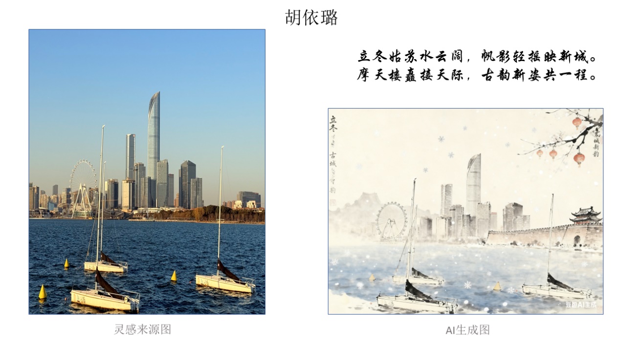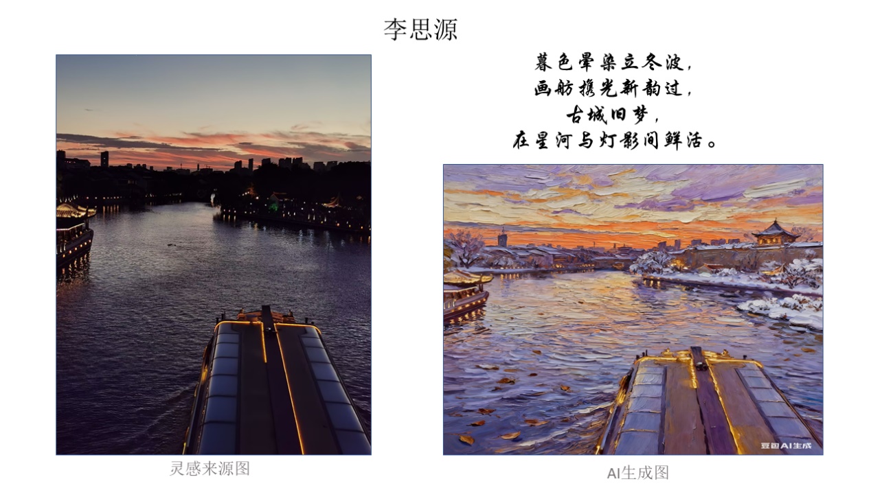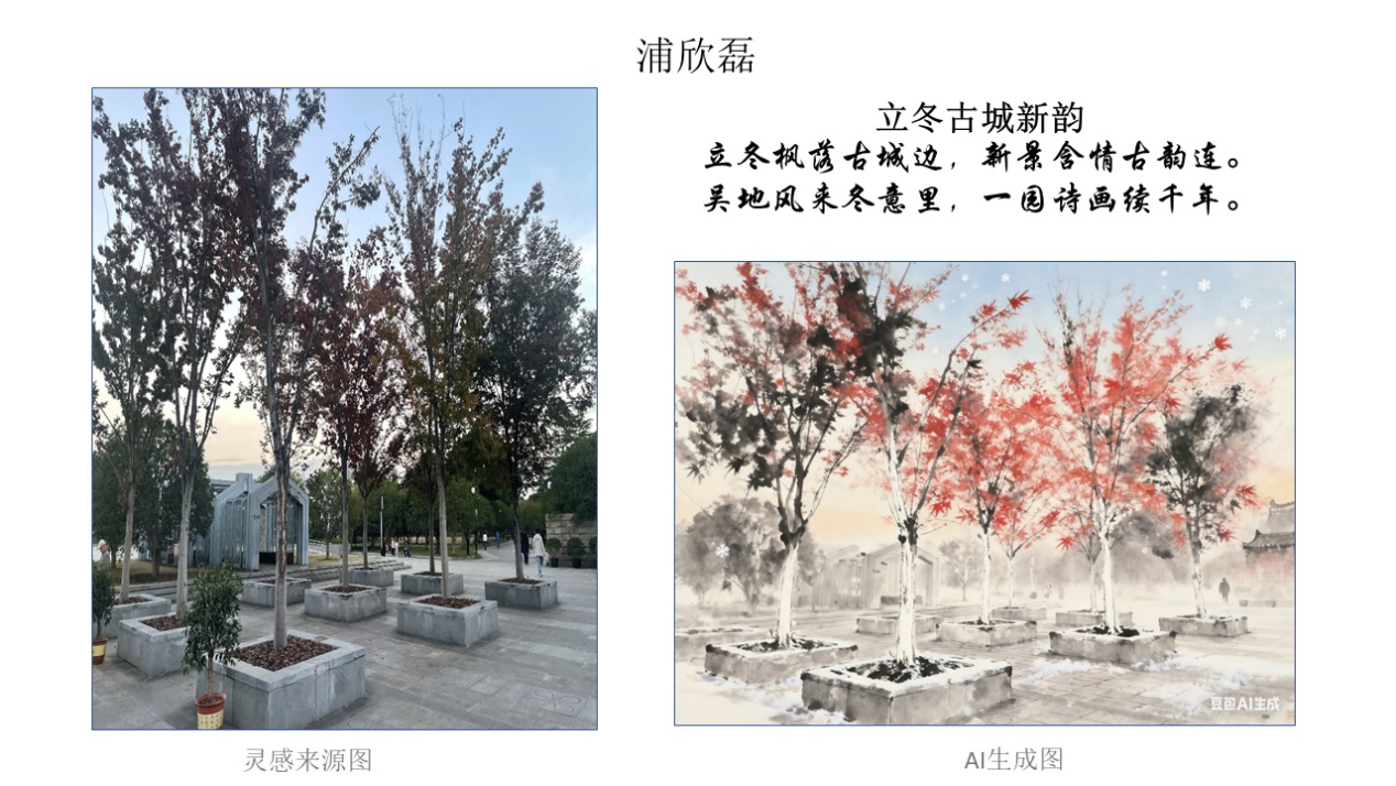 活动中,同学们走进平江路、拙政园等苏州街巷园林,用镜头捕捉立冬时节的气候变化与人文风貌。随后,大家借助DeepSeek、文心一言等AI工具,围绕“诗说冬踪”与“画意新编”两大方向进行创作,将实地拍摄转化为具有水墨、油画等风格的数字艺术作品,并融入诗词创作,深化了冬日意境的表达。