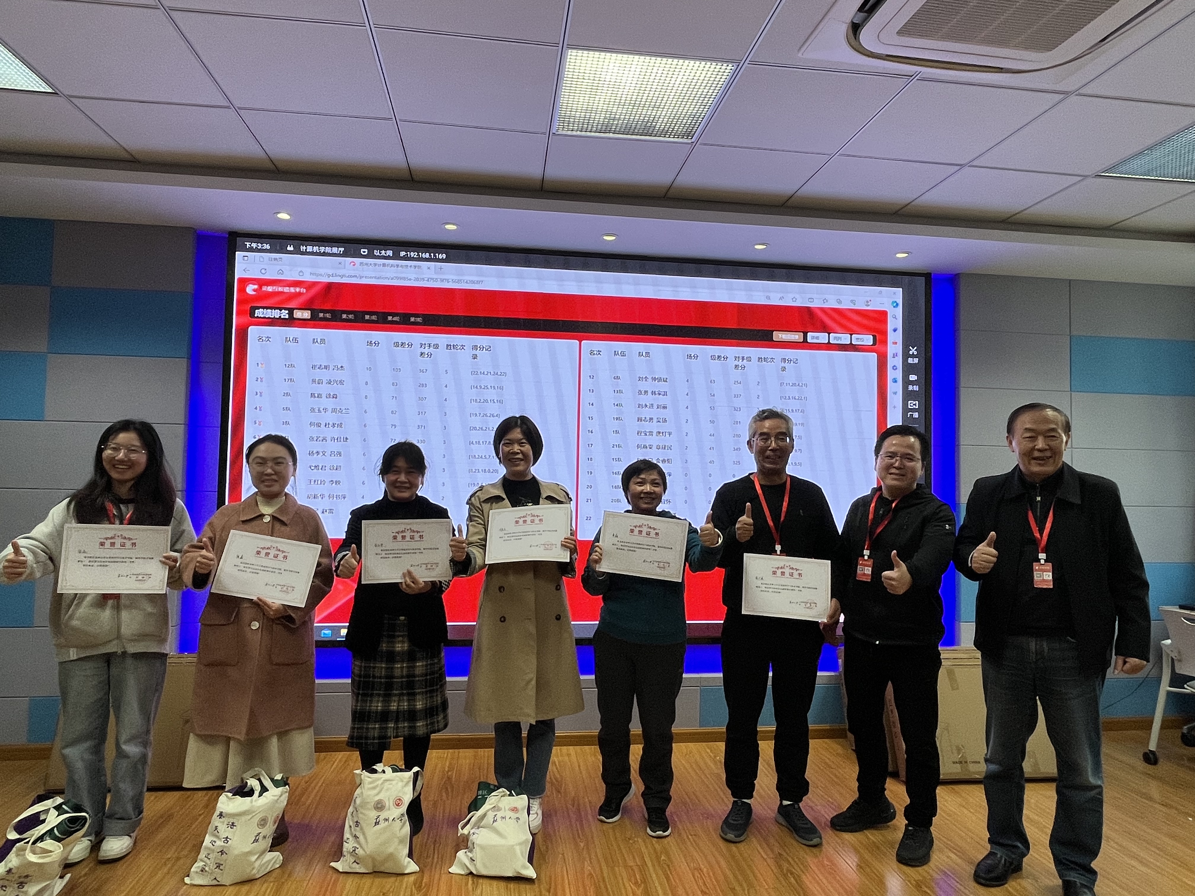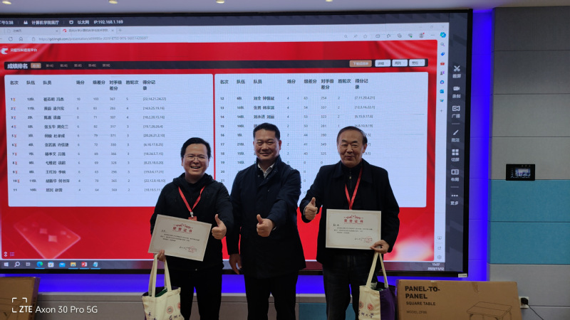 经过一天的激烈角逐,终于迎来了激动人心的颁奖环节,主持人宣读了本次比赛的获奖名单,学院党委书记胡新华老师分别为获得一、二、三等奖的选手颁发了奖状和奖品。胡书记并对本次提供技术支持和活动赞助的冯杰校友公司灵缇互娱(苏州瑞立思科技有限公司表达了感谢,希望以本次掼蛋比赛为纽带,未来学院教师和校友之间能增加更多的互动和情感交流。