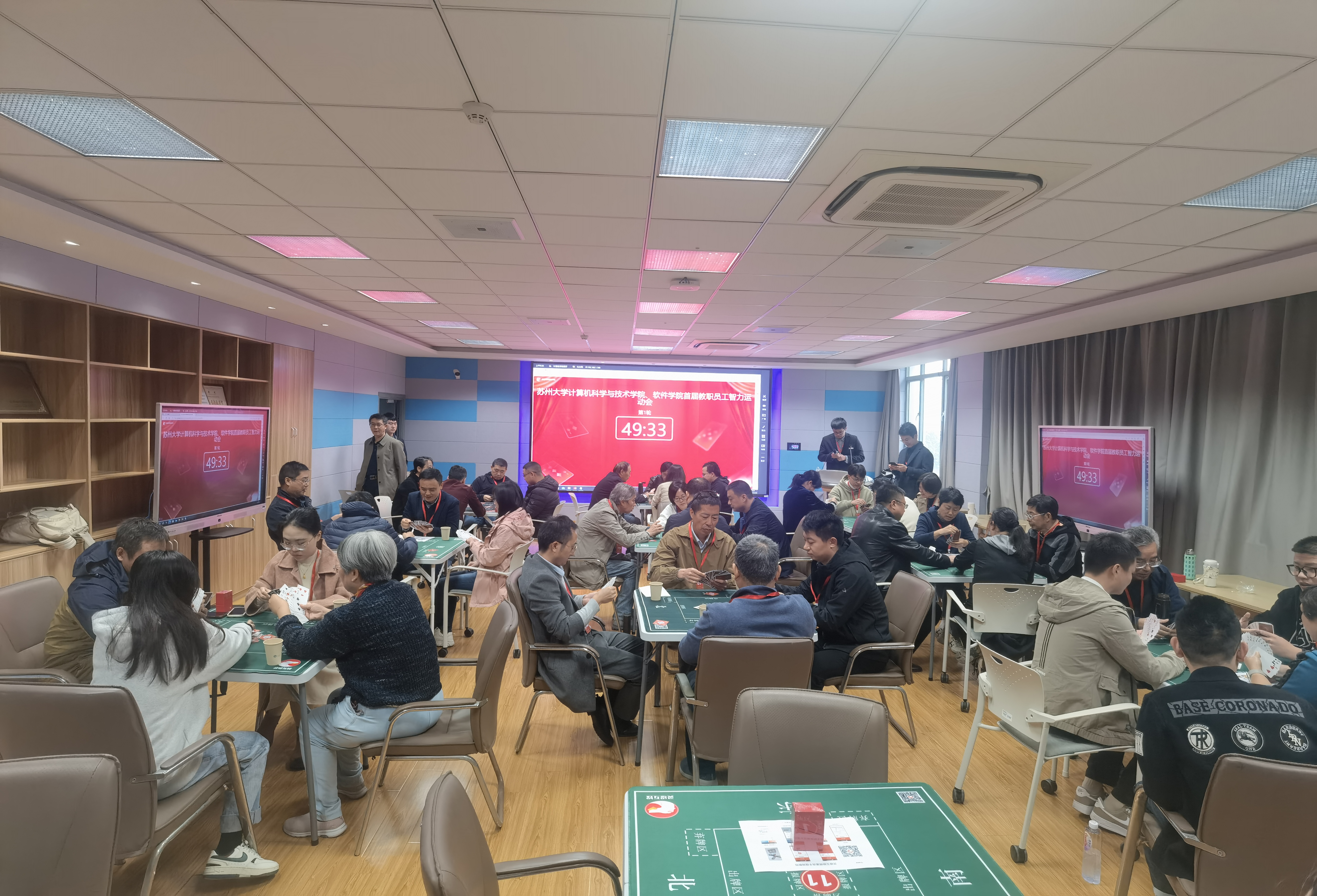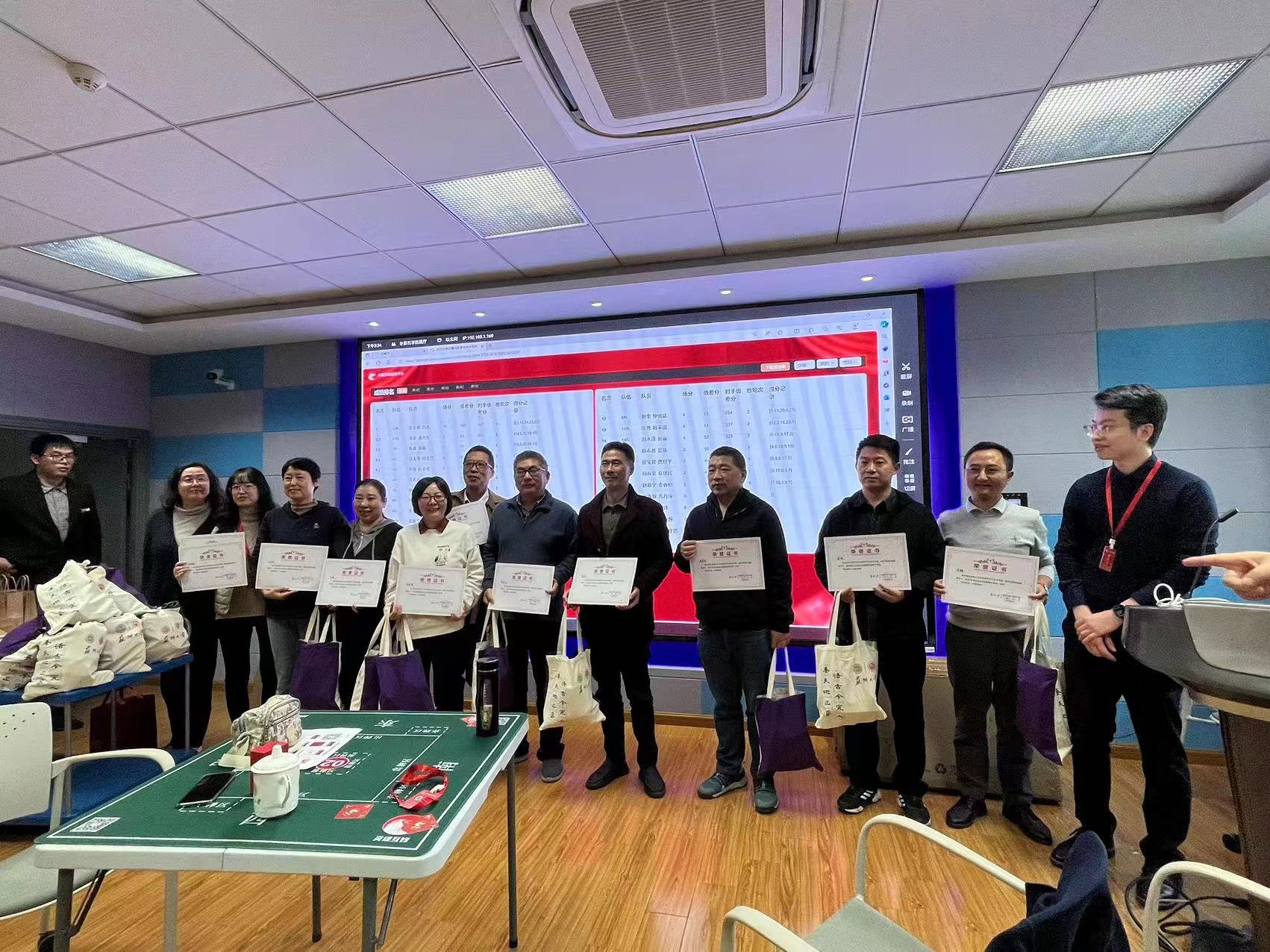 整场活动在一种既紧张又友好的氛围中展开,友谊与智慧在牌局中交融,相映成辉。在首轮比赛中,选手们以他们的沉稳和精湛的牌技,以及与队友间的默契配合,展示了他们的实力。比赛进入中段后,他们的表现更是超越了常规水平,团队合作精神得到了充分的展现。教师和校友们的配合和合力使得现场气氛异常热烈,他们全神贯注地投入比赛,时而紧张地屏住呼吸,期待着每一局的胜负结果,时而欢呼雀跃,为精彩的比赛瞬间喝彩。