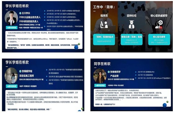 2013届毕业生邵文武在分享中提到,当年放弃了保研、其他大厂的机会去了帆软软件,现在是帆软简道云技术的负责人。他说公司愿意向员工提供足够的机会,鼓励公司内部人才流动,寻找最属于自己的位置。“我们不招空降兵”,公司更愿意把机会留给新鲜血液,这也正是他们坚持校招的重要原因。帆软公司员工之间的关系尤为简单融洽,“公司里拒绝喊某总、某董,公司甚至会公费让员工组建兴趣小组,在这里可以结交到太多有趣的朋友。”
