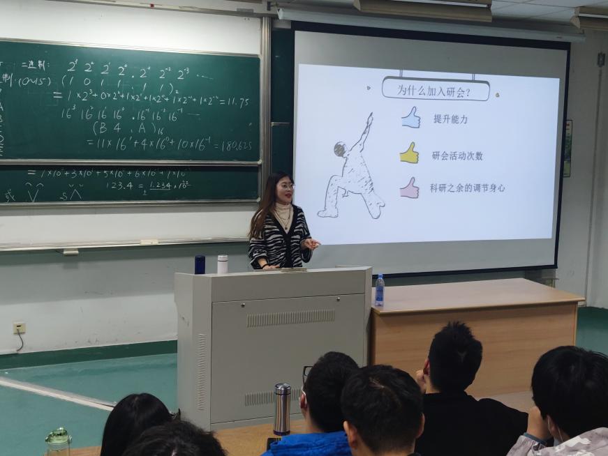 研究生会是研究生群体中非常重要的学生组织,也是连接老师与学生之间的桥梁。学生工作不仅可以提升学生自我工作的能力,也是科研之余的一种身心调节。王薇同学向大家介绍了研究生会的职能、组织架构、工作内容,讲述了学生工作的意义,并向大家展示了往期研会举办的精彩的校园文化活动,鼓励大家踊跃报名加入其中。