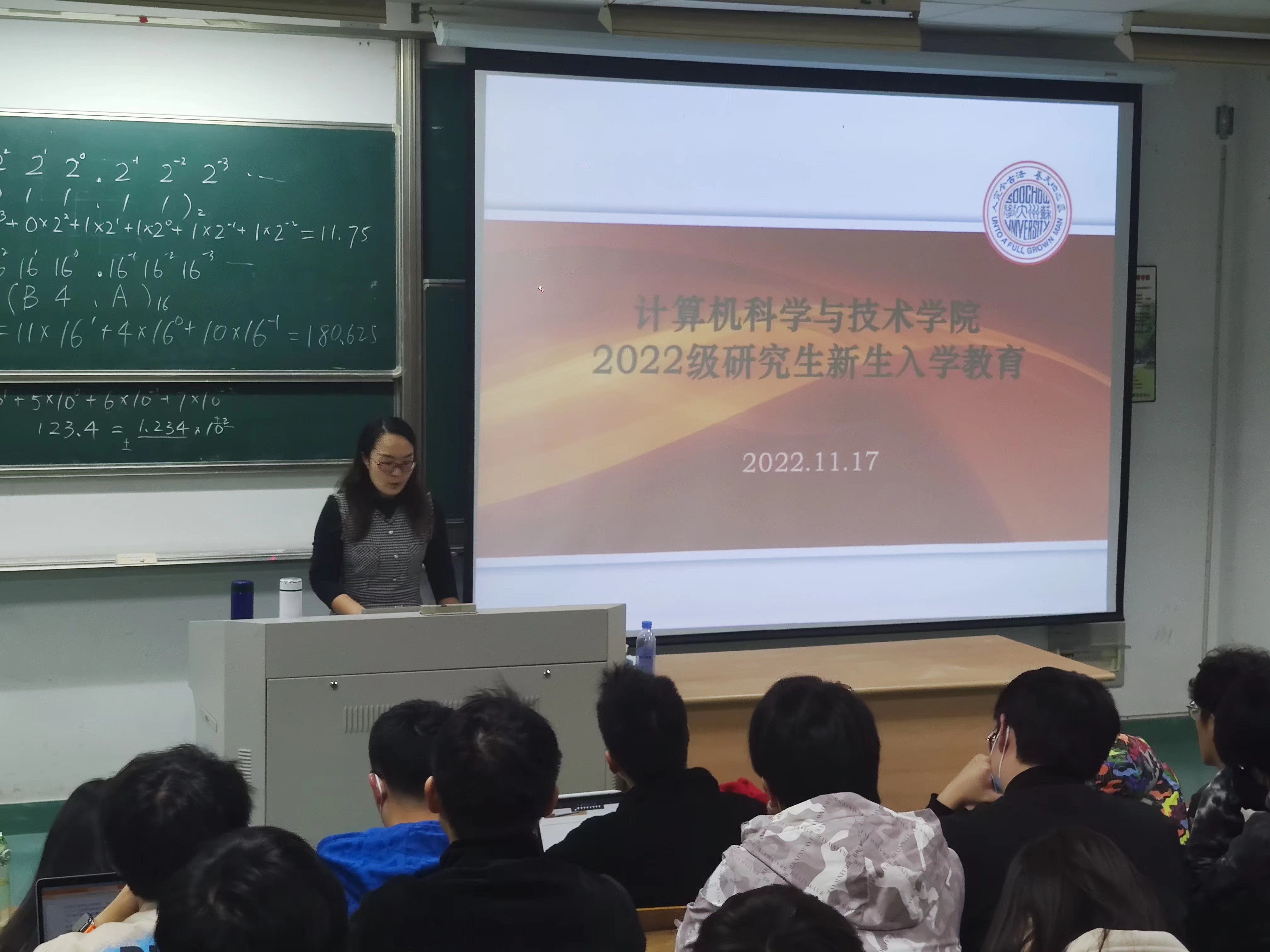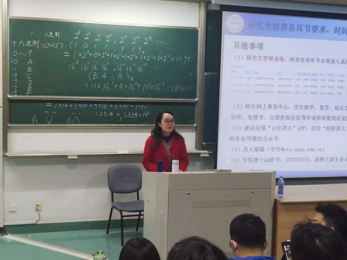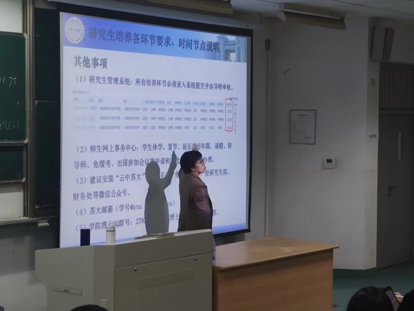 大会第一项议程是由学院教务秘书何倩老师为大家介绍研究生培养的相关事务。何老师主要讲了研究生期间培养各个环节要求,包括一些重要时间节点,研究生管理系统的相关内容等。向大家详细阐述了研究生期间尤其是培养、科研环节的重要事项,为大家领航。